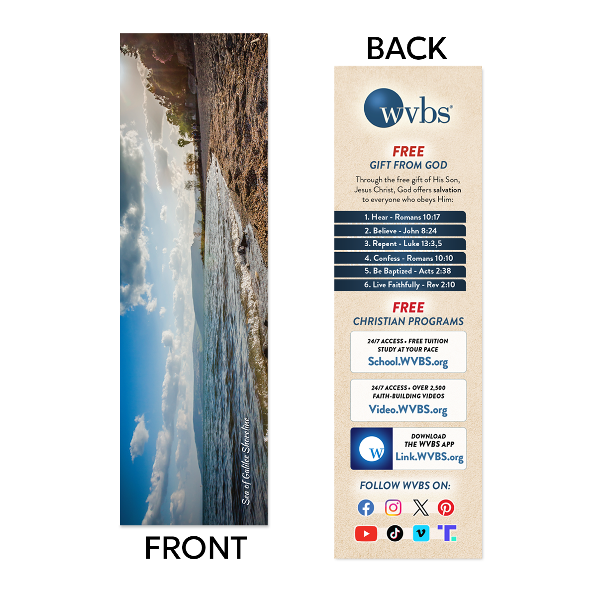 WVBS has now made available our very popular bookmark. On the front is a beautiful picture of the “Sea of Galilee Shoreline” and a lot of great evangelism information on the back. It makes a great giveaway product to guide your friends to a wealth of Bible study information. These beautiful bookmarks come 250 per box. (December 2025)
